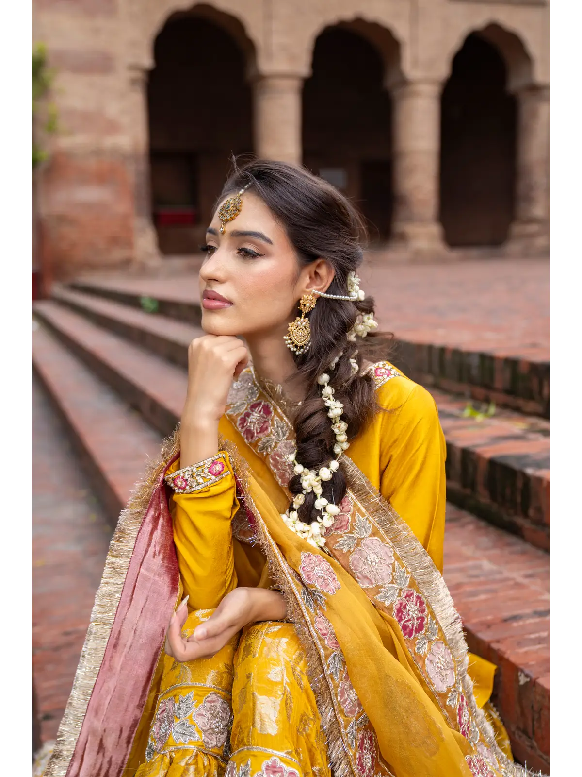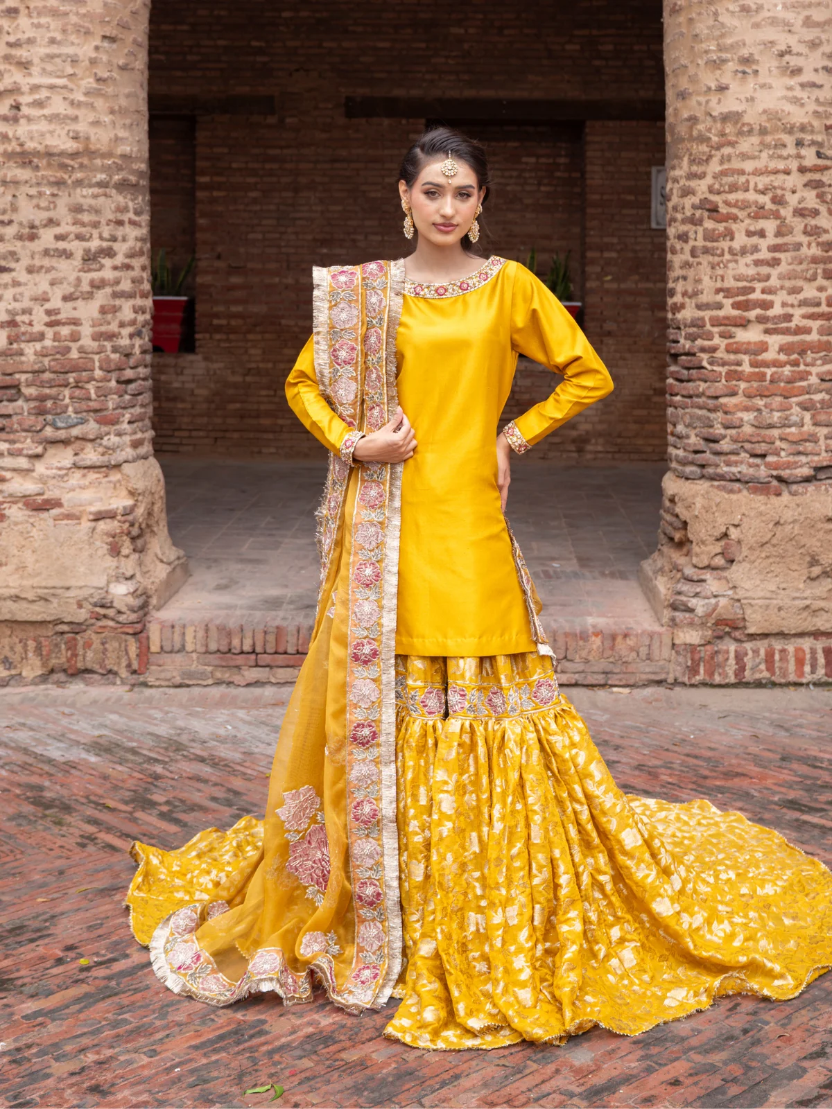 Our Sunehri set is a radiant ode to timeless tradition and craftsmanship. The pure raw silk shirt is delicately adorned with resham and zardozi embroidery along the neckline and sleeve openings, exuding refined elegance. Paired with a stunning farshi gharara in loras chiffon, detailed with pure tissue appliqué and intricate zardozi work, it beautifully revives the grandeur of classical handwork. The look is completed with a pure organza net dupatta, featuring exquisite borders that echo the gharara’s artistry — a perfect harmony of heritage and sophistication.